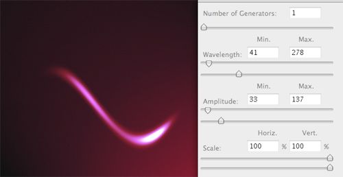 從這步開始變的很有意思。有兩個濾鏡可以使光效變的像光紋:波浪(濾鏡》扭曲》波浪)和(濾鏡》扭曲》旋轉扭曲)。用波浪可以制作各式各樣不規則的紋路。像其他濾鏡一樣,可以調節滑塊來取得理想的效果。但是或許應該適當調大波長和波幅。同樣,試著在同一圖層多次運用“波浪” 濾鏡。