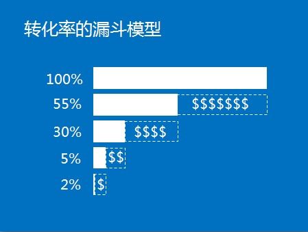 來看下網站分析中的經典漏斗模型。100%的訪問者進入網站,45%的訪問者跳出離開網站,這些訪問者沒有機會轉化為客戶為你帶來收入了,同時你花費在他們身上的廣告費也打水漂了。只剩下55%的訪問者繼續前進。在下一級頁面,因為導航設計問題,又有25%的訪問者離開網站。你失去了這部分訪問者的訂單,同時再一次浪費了廣告費。繼續前進,因為頁面內容問題,轉化渠道阻力及流失問題,不斷有訪問者離開網站。最終只有2%的訪問者成功下單支付,完成了網站的目標。而在這整個過程中你損失了98%的訪問者,這些訪問者可能產生的收入,以及為了獲取這些訪問者而支付的廣告費。在這個漏斗模型中,要增加最終的收入有兩個方法。1獲得更多的訪問者,當然購買訪問者是需要花錢的,并且你依然在浪費廣告費。這并不能讓你獲得更多的收入。2提升每一步的轉化率,降低訪問者的流失比例。