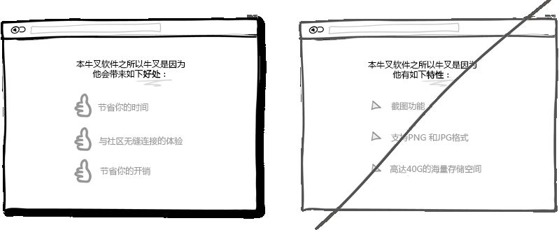 市場(chǎng)就是這樣的,用戶永遠(yuǎn)只關(guān)心自身利益而產(chǎn)品特性對(duì)他們來說倒不是那么重要。只有利益才更直觀地體現(xiàn)出使用產(chǎn)品所帶來的價(jià)值。Chris Guillebeau在他的著作《100美元起家》中指出,相比壓力,沖突,煩心事和未知的未來,人們?cè)诤醯酶嗟氖菒郏疱X,認(rèn)同感和自由支配的空閑時(shí)間。所以我相信在展示產(chǎn)品特性時(shí)回歸到利益上是必要的。